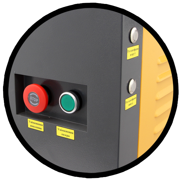 - Вихідний промінь пристрою містить видиме і невидиме випромінювання, яке згубно впливає на очі людини. Ні в якому разі не дивіться на лазерний промінь під час роботи! При знаходженні поруч з лазерною системою повинні використовуватися спеціальні захисні окуляри, що забезпечують належний захист від лазерного випромінювання.