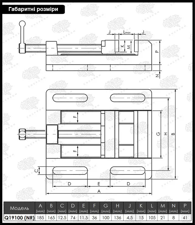 Q19100 (NR) - верстатні неповоротні лещата серії Q19 з шириною губок 100 мм і максимальним розкриттям 105 мм, які застосовуються для надійного затиску деталі при обробці на свердлильному або невеликому фрезерному верстаті. Конструктивно інструмент являє собою кілька паралельних губок одна з яких є нерухомою, а друга притискається до деталі за допомогою трапецієподібного гвинта. Низький профіль лещат забезпечує їх стійке положення. Накладки (пластинки) на губках є знімними, що знижує витрати на обслуговування виробу в цілому, а також підвищує ефективність роботи. Пластинки мають протиковзну поверхню з поглибленнями, які формують так звану ромбоподібну сітку. Це дозволяє надійно і точно затискати заготовки. На підставці лещат передбачені монтажні отвори для точного позиціювання і надійного кріплення пристосування на робочому столі верстата.