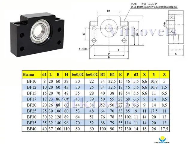Кінцева опора BF17 являє собою корпус з монтажними отворами з двома шарикопідшипниками. Опори даної серії служать для фіксації приводного кінця гвинта передачі. Ефективно передає всі виникаючі зусилля з гвинта на станину, що збільшує максимальну швидкість обертання гвинта і довговічність передачі.