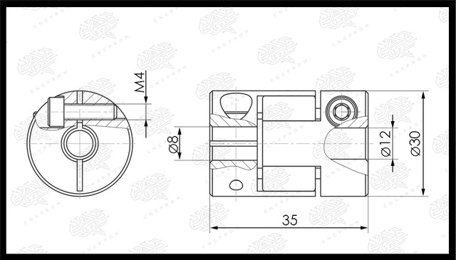 Кулачкова муфта 8х12 С (L35, D30) - з'єднувальна віброгасна муфта завдовжки 35 мм і зовнішнім діаметром 30 мм, яка використовується для прямого передавання крутного моменту між співвісними валами діаметром 8 мм і 12 мм.