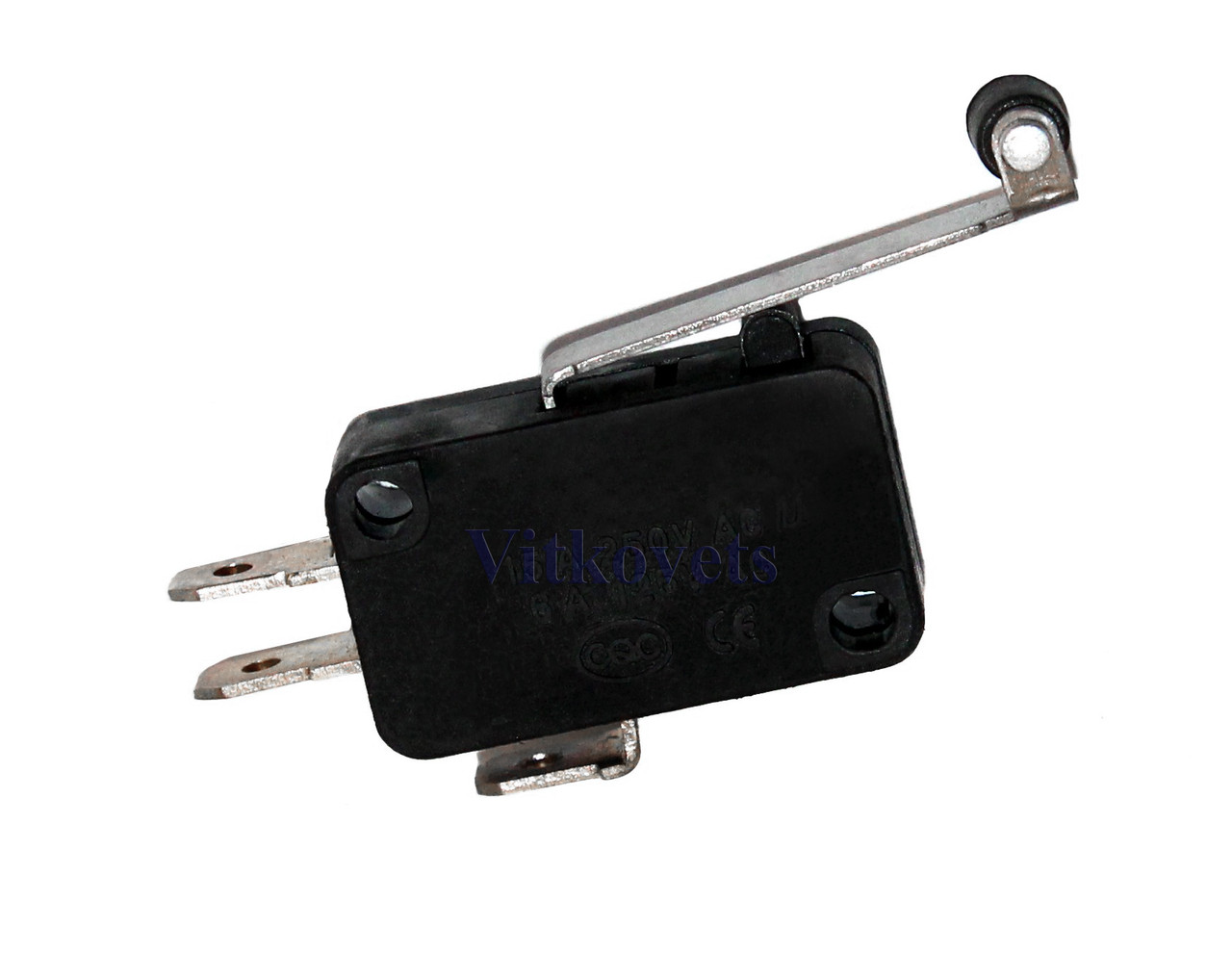 Кінцевий вимикач (кінцевик, мікрик) використовується для індикації крайніх положень електромеханічних виконавчих механізмів. На кінчику важеля встановлений рухомий ролик. Працює при максимальному струмі комутації змінної напруги - 15 А 250V. Наявність трьох контактів дозволяє комутувати ланцюг на замикання або розмикання.